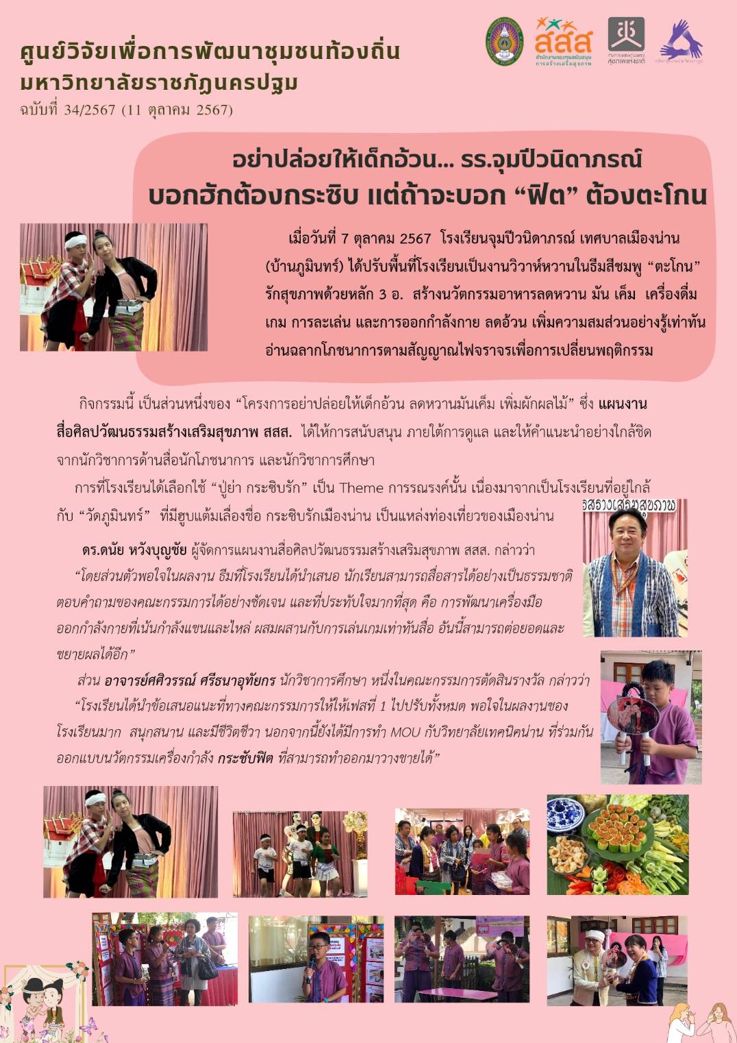เมื่อวันที่ 7 ตุลาคม 2567 โรงเรียนจุมป่วนิตาภรณ์ เทศบาลเมืองน่าน (บ้านภูมินทร์) ได้ปรับพื้นที่โรงเรียนเป็นงานวิวาห์หวานในธีมสีชมพู “ตะโกน” รักสุขภาพด้วยหลัก 3 อ. สร้างนวัตกรรมอาหารลดหวาน มัน เค็ม เครื่องดื่ม เกม การละเล่น และการออกกำลังกาย ลดอ้วน เพิ่มความสมส่วนอย่างรู้เท่าทัน อ่านฉลากโภชนาการตามสัญญาณไฟจราจรเพื่อการเปลี่ยนพฤติกรรม