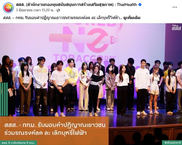 Facebook สสส. (สำนักงานกองทุนสนับสนุนการสร้างเสริมสุขภาพ) : ThaiHealth ลงข่าว : สสส. – กทม. รับมอบคำปฏิญาณเยาวชนร่วมรณรงค์ลด ละ เลิกบุหรี่ไฟฟ้า