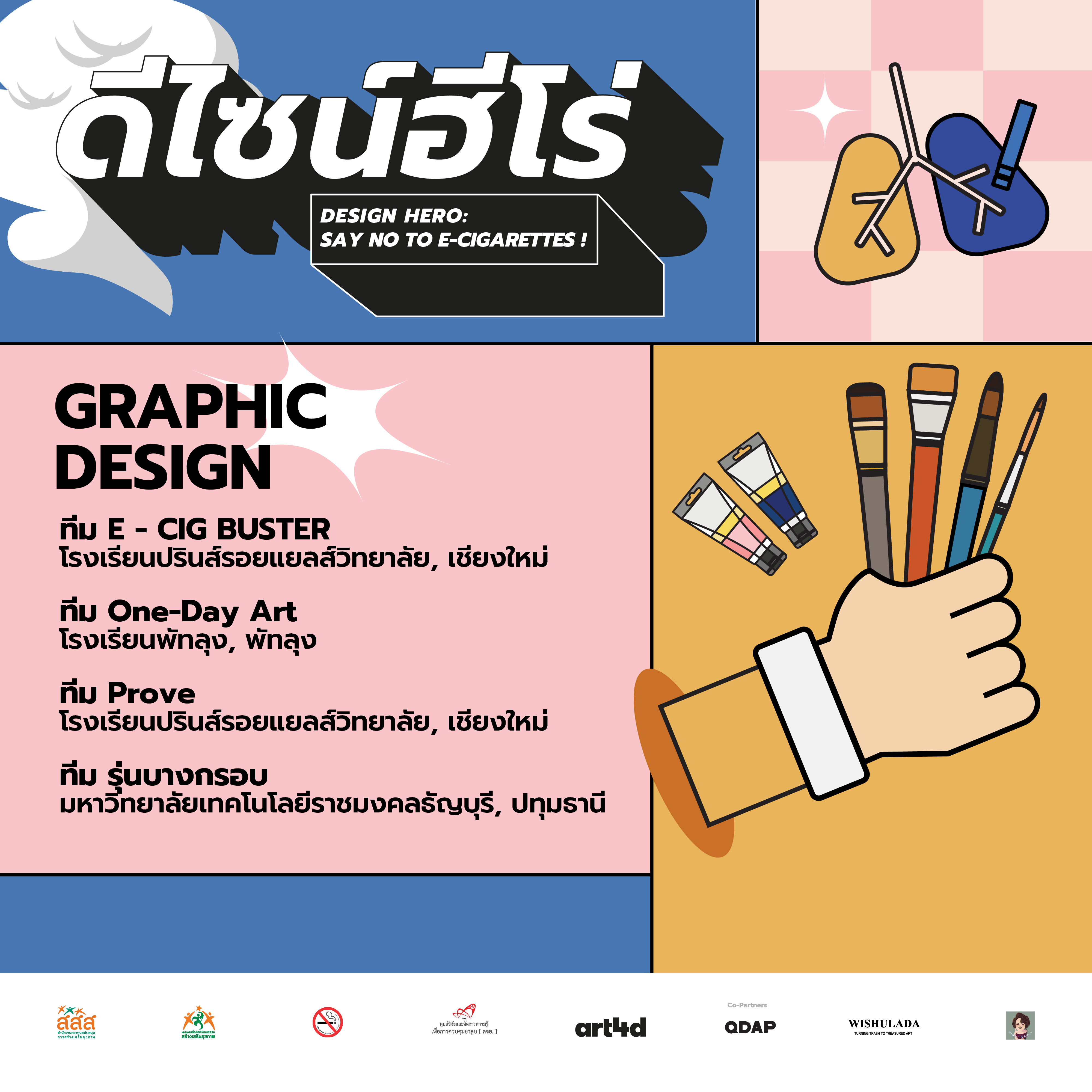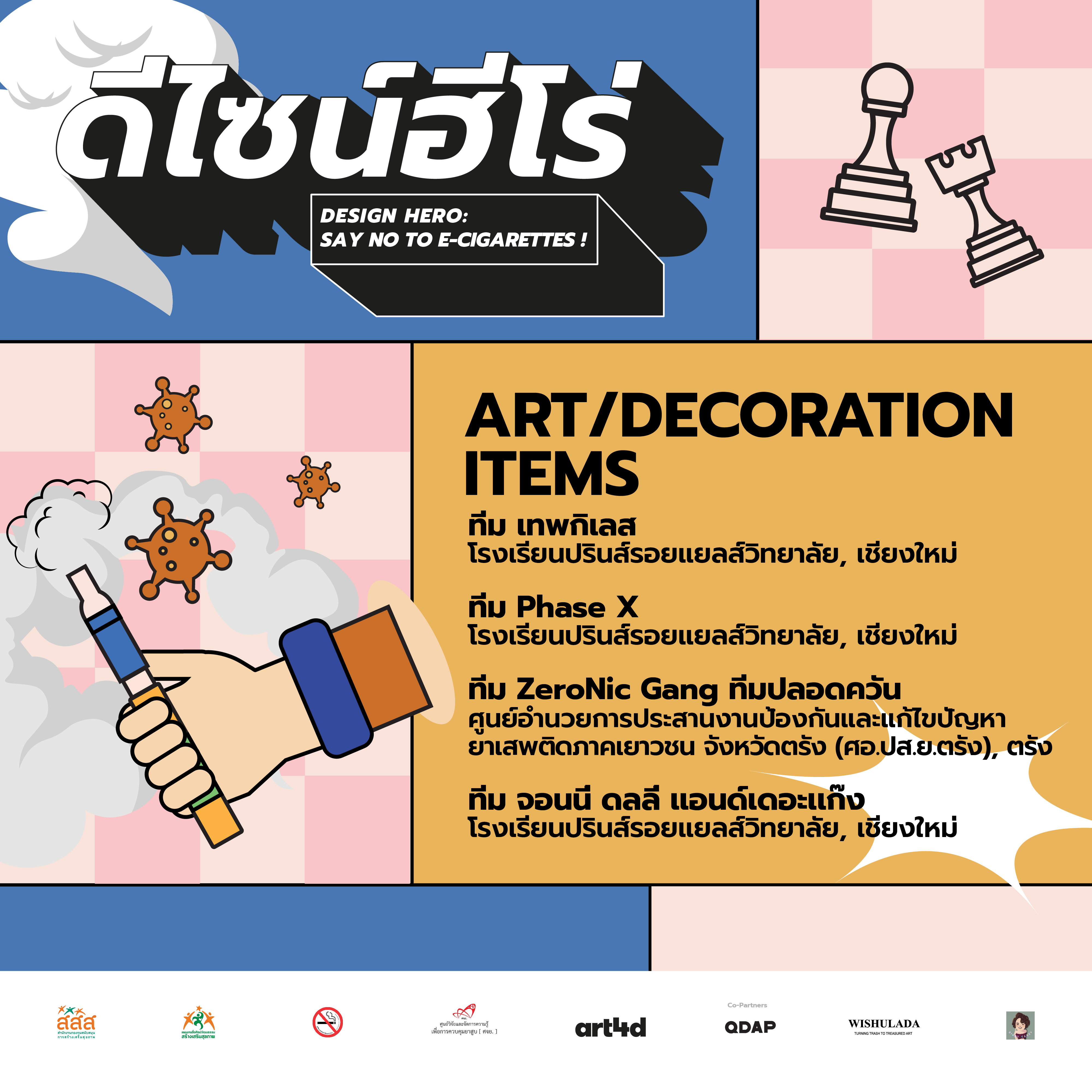คณะกรรมการผู้ทรงคุณวุฒิได้พิจารณาคัดเลือกผลงานที่มุ่งมั่นในการรณรงค์เรื่องภัยร้ายจากบุหรี่ไฟฟ้าจนได้รายชื่อทีมที่โดดเด่น และพร้อมพัฒนาผลงานสู่การสร้างความเปลี่ยนแปลงในสังคม ดังนี้