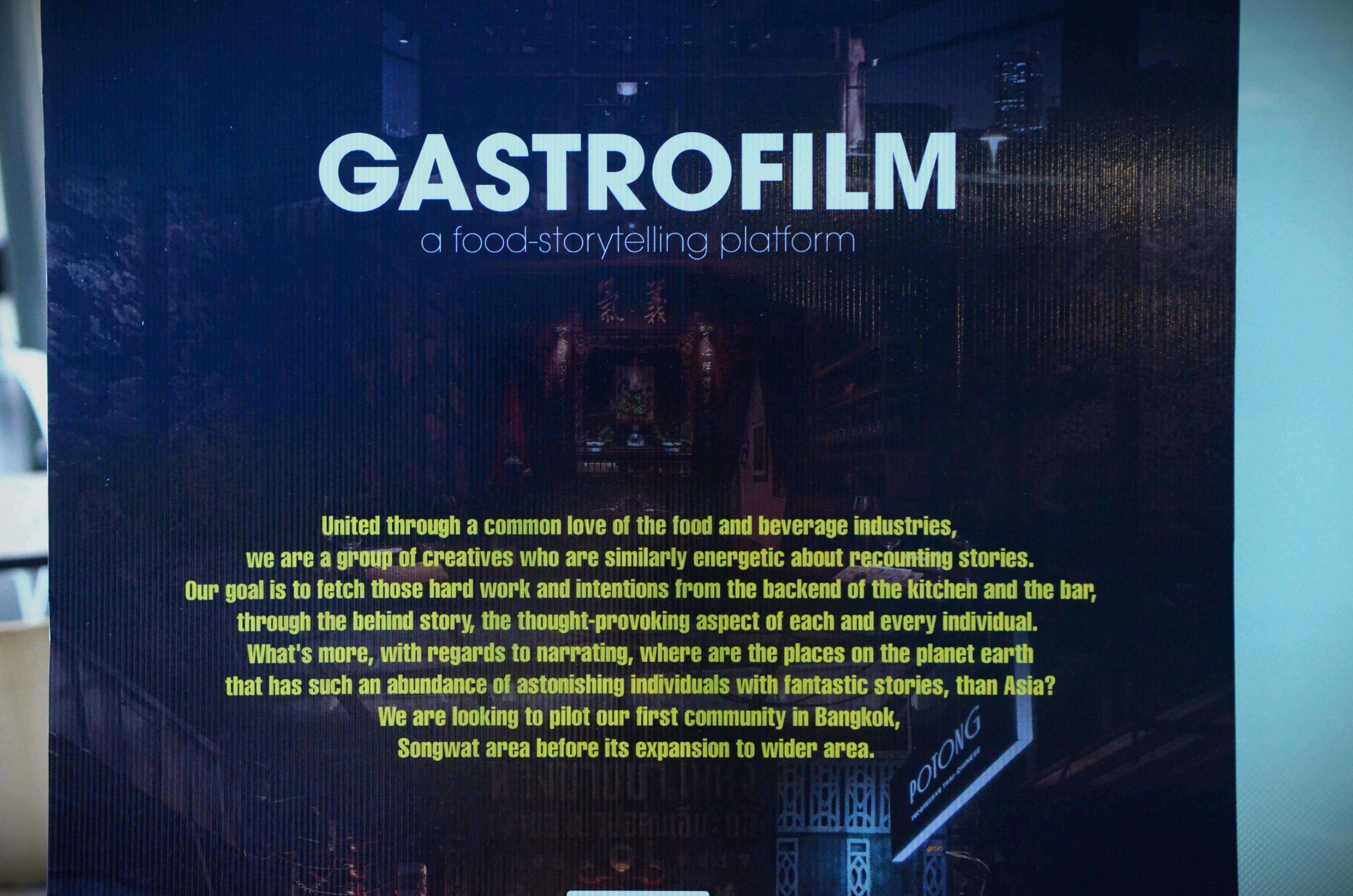 Gastrofilm คือกลุ่มนักสร้างสรรค์ที่ทำงานผ่านการเล่าเรื่องราว กับความรักใน อุตสาหกรรมอาหารและเครื่องดื่ม ชอบทำงานเล่าเรื่องราวในลักษณะเดียวกัน เป้าหมายของ Gastrofilm คือการดึงเอาความทุ่มเทและความตั้งใจเหล่านั้น มาจากเบื้องหลังของครัวและบาร์ โดยการถ่ายทำในสถานที่แรก ทีม Gastrofilm ได้เข้าไปถ่ายทำรายการนั้น คือ ร้านโพทง Potong ซึ่งเป็นร้านอาหารของเชฟแพมที่ได้รับ รางวัล Michelin และรางวัล New Restaurant of The Year จาก Michelin เป็นการถ่ายทำที่ถ่ายทอดเรื่องราวอาหารในรูปแบบของ Chef's Table ซึ่งการถ่ายทำรายการเริ่มต้นอยู่ในกรุงเทพฯ ที่ย่านทรงวาด ก่อนจะขยายเป็นวงกว้างไปยังสถานที่อื่น ๆ